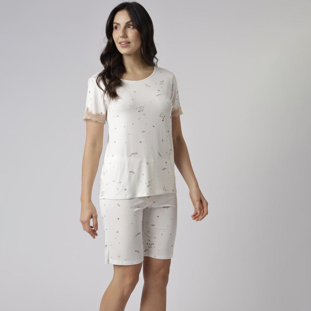 A blusa de manga curta, em visco comfort, possui detalhe em renda delicada nas mangas, enquanto a bermuda, também em visco comfort, apresenta caimento suave com acabamento contrastante na barra, complementando a estampa brisa com charme.
