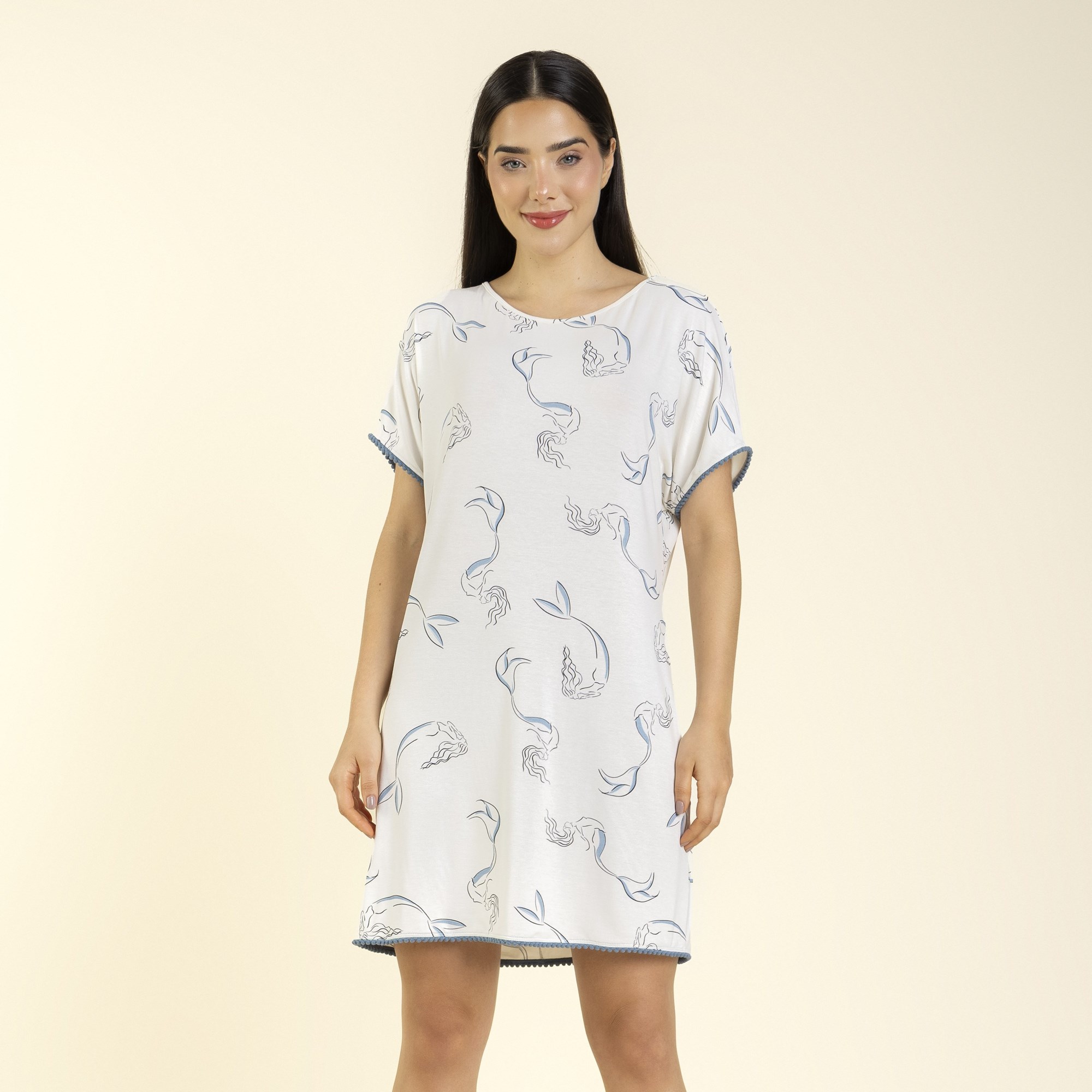 O modelo, em visco comfort, é curto, possui manga curta, decote arredondado, viés azul e cor branco com estampa de sereia.
