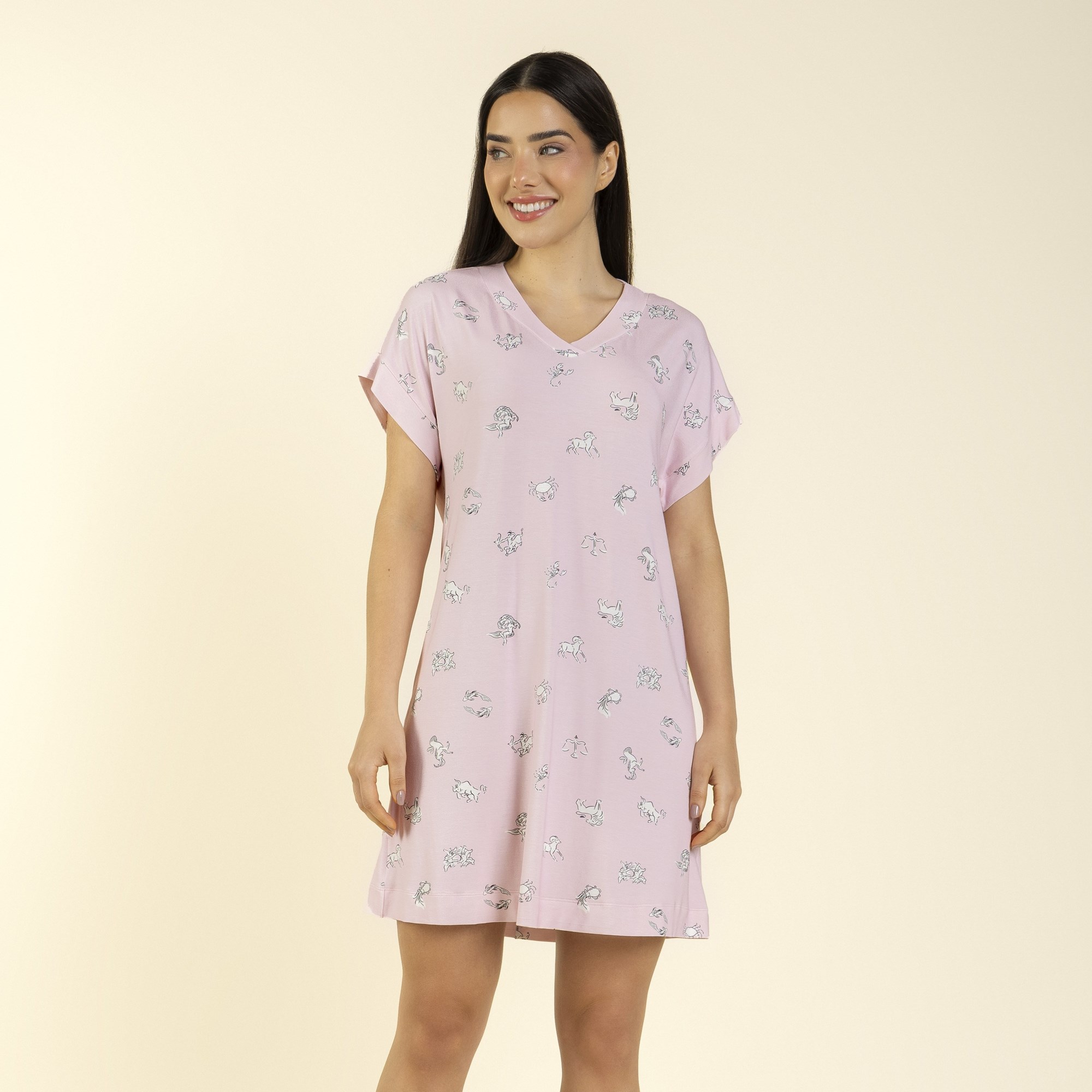 Confeccionado em visco comfort, possui modelagem soltinha, mangas curtas e gola em “V”. A cor rosa com estampa temática de signos traz um toque divertido e moderno.