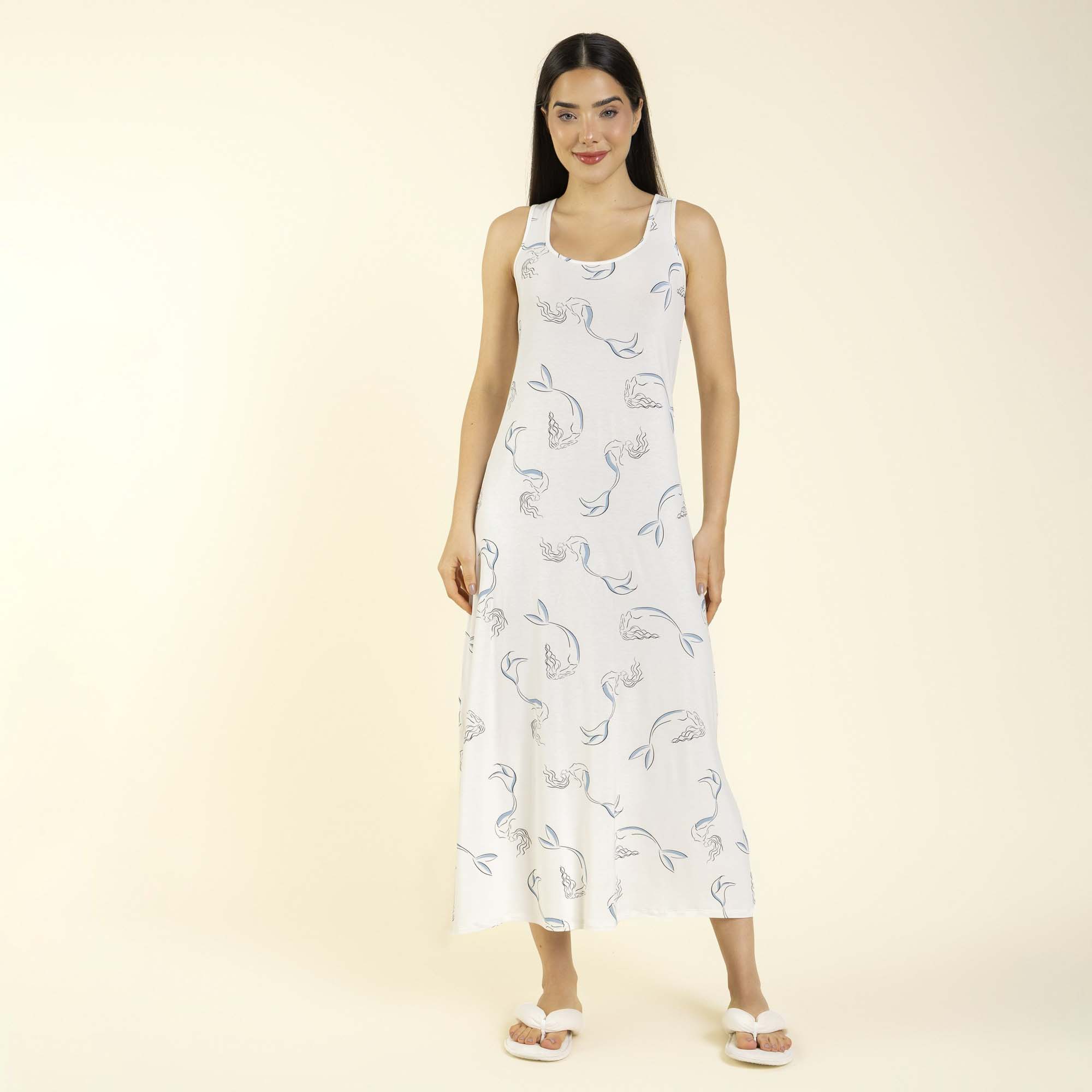 O modelo, em visco comfort, é longo, regata, possui decote em 'U' e cor branco com estampa de sereia.