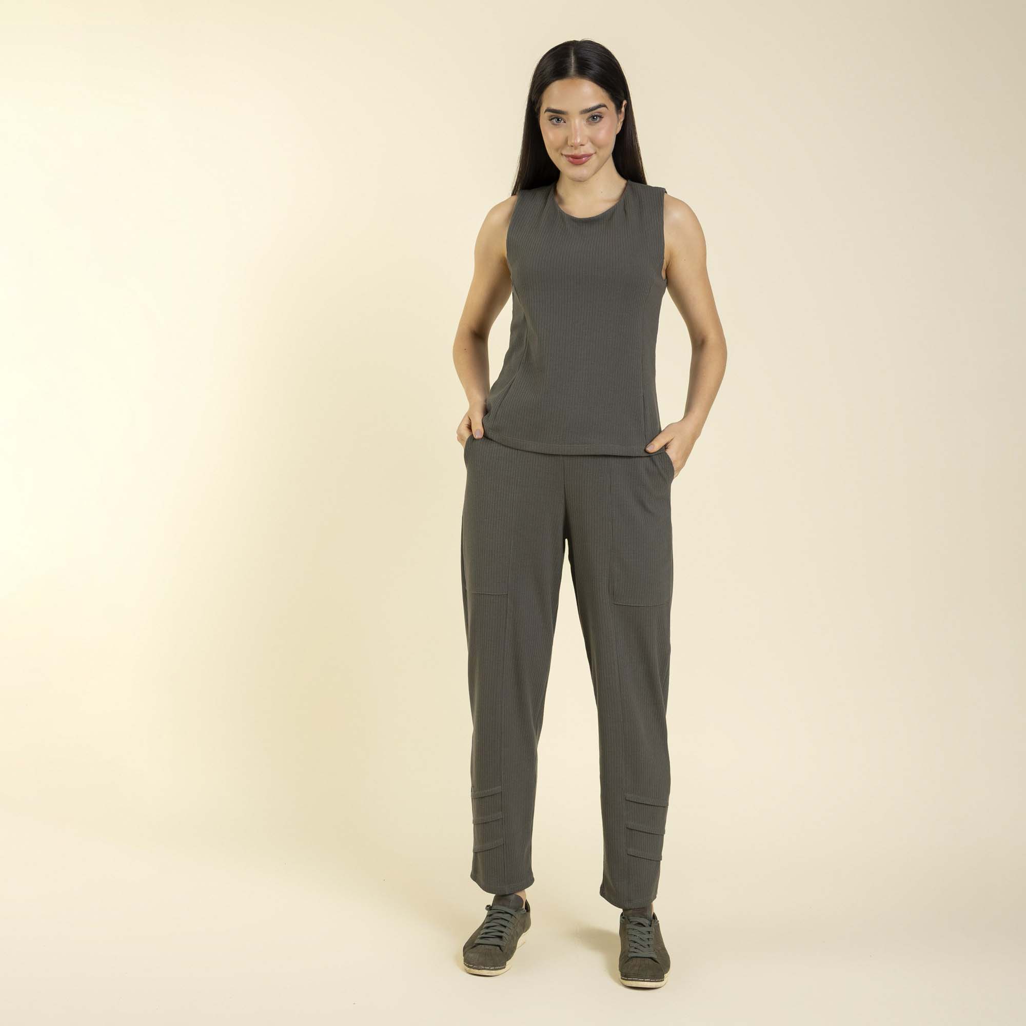 Feito em piquet canelado de algodão, o look é composto por blusa sem mangas com modelagem reta e calça de caimento solto, com bolsos funcionais. Ideal para produções casuais e modernas.