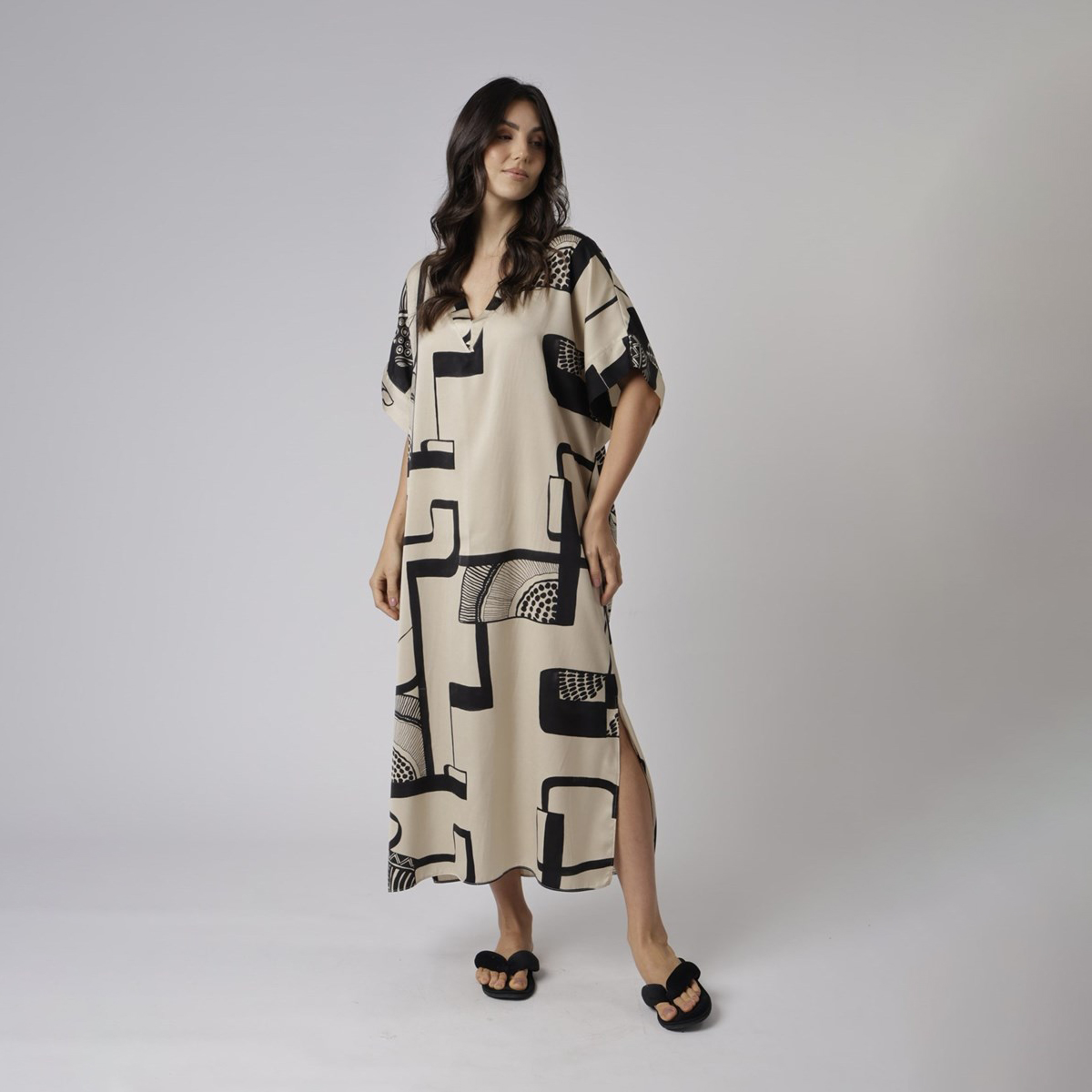 Confeccionado em tecido plano acetinado, o modelo longo possui mangas curtas, decote delicado em ‘V’ e fendas laterais, proporcionando fluidez ao vestir, além da moderna estampa abstrata.