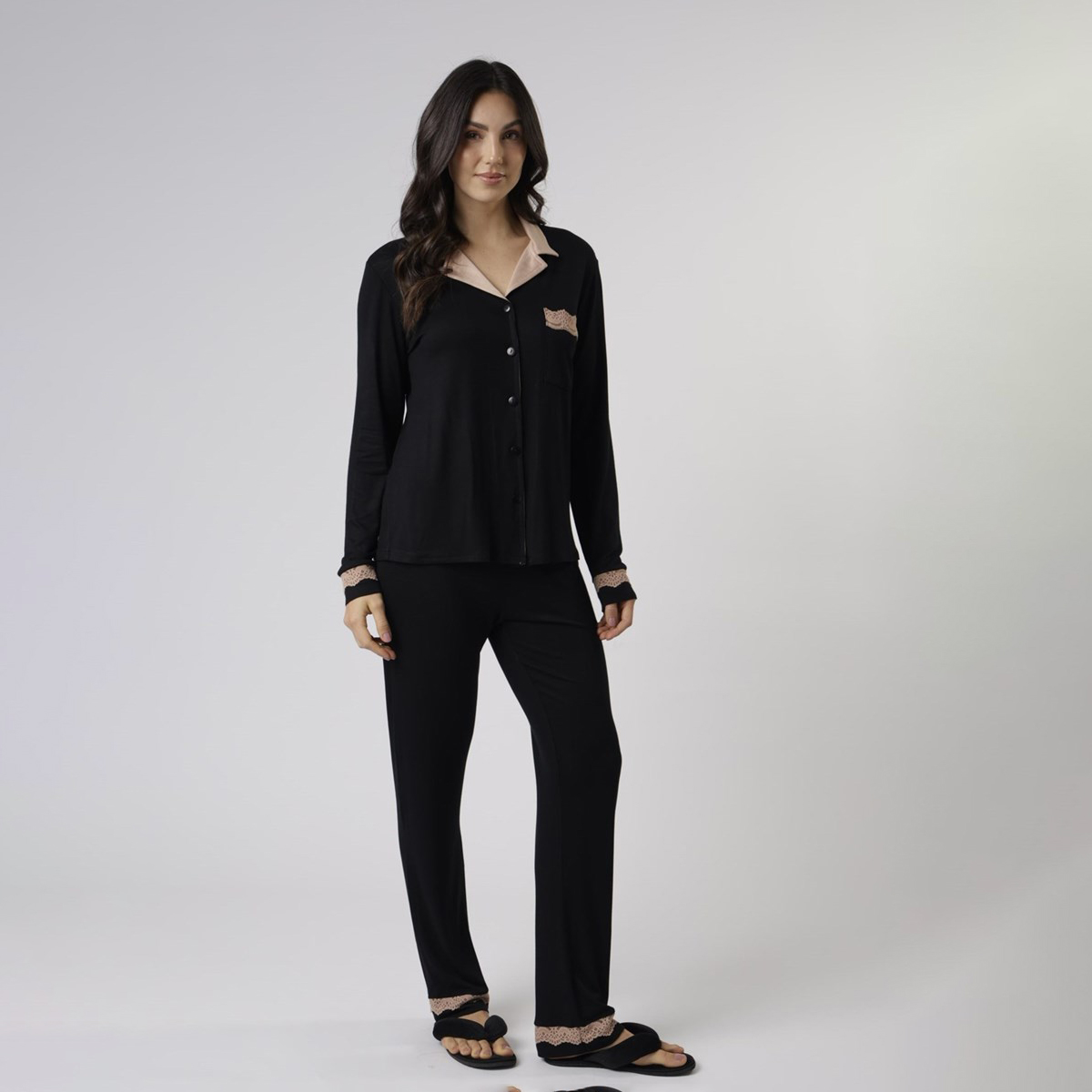 Produzido em visco maquinetada, possui blusa com gola esporte, bolso e manga longa, além do detalhe em cor contrastante grão para mais elegância e sofisticação. A calça possui caimento leve, toque macio e detalhe na barra na cor grão. A cor preta reforça a proposta clássica e versátil da peça.
