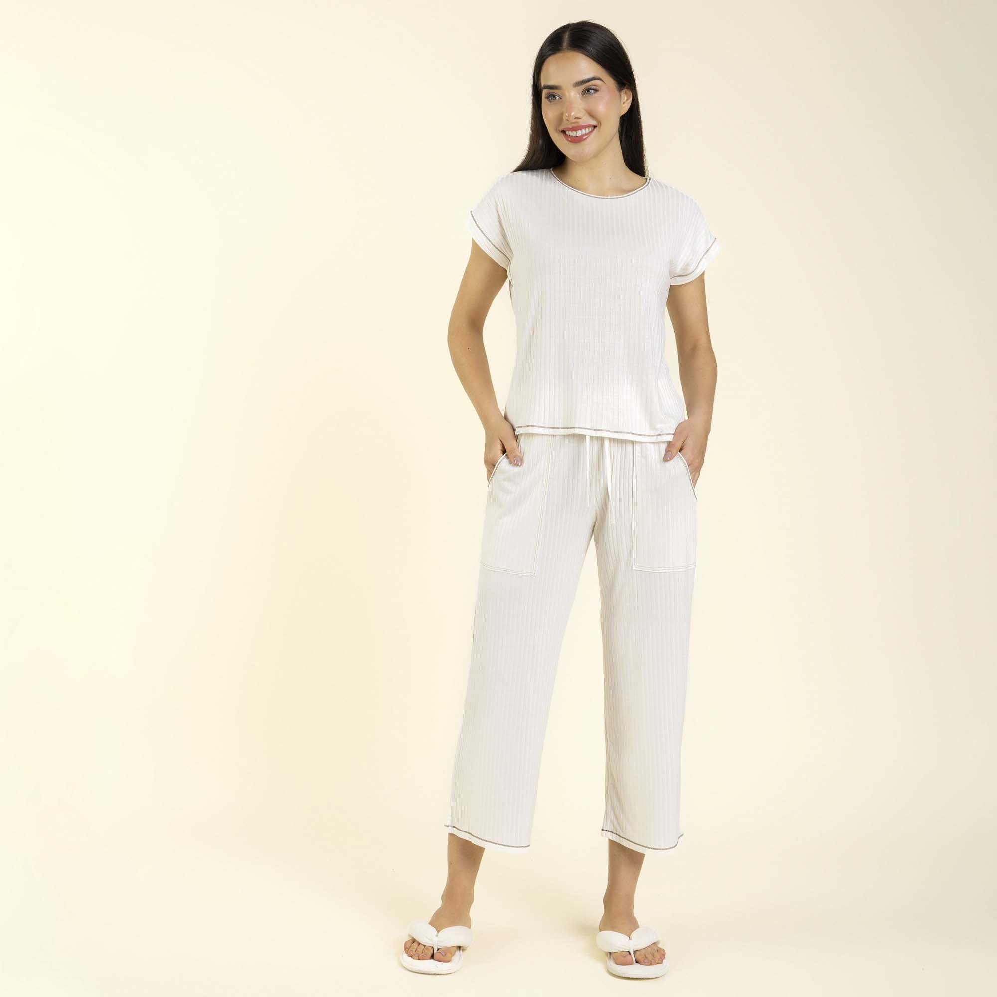 O conjunto, em canelado largo visco, tem blusa de mangas curtas com decote arredondado e cor off white. A calça capri é off white, tem bolso e possui modelagem ampla que proporciona liberdade de movimentos.