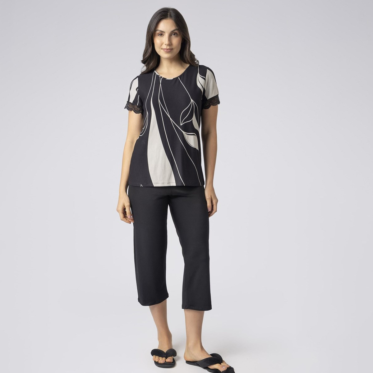 A blusa estampada, em visco premium rongeant, possui mangas curtas com detalhe em renda, decote arredondado que proporciona delicadeza ao acabamento. A calça capri preta, no mesmo tecido, apresenta caimento fluido e comprimento moderno, ideal para momentos de descanso com estilo.