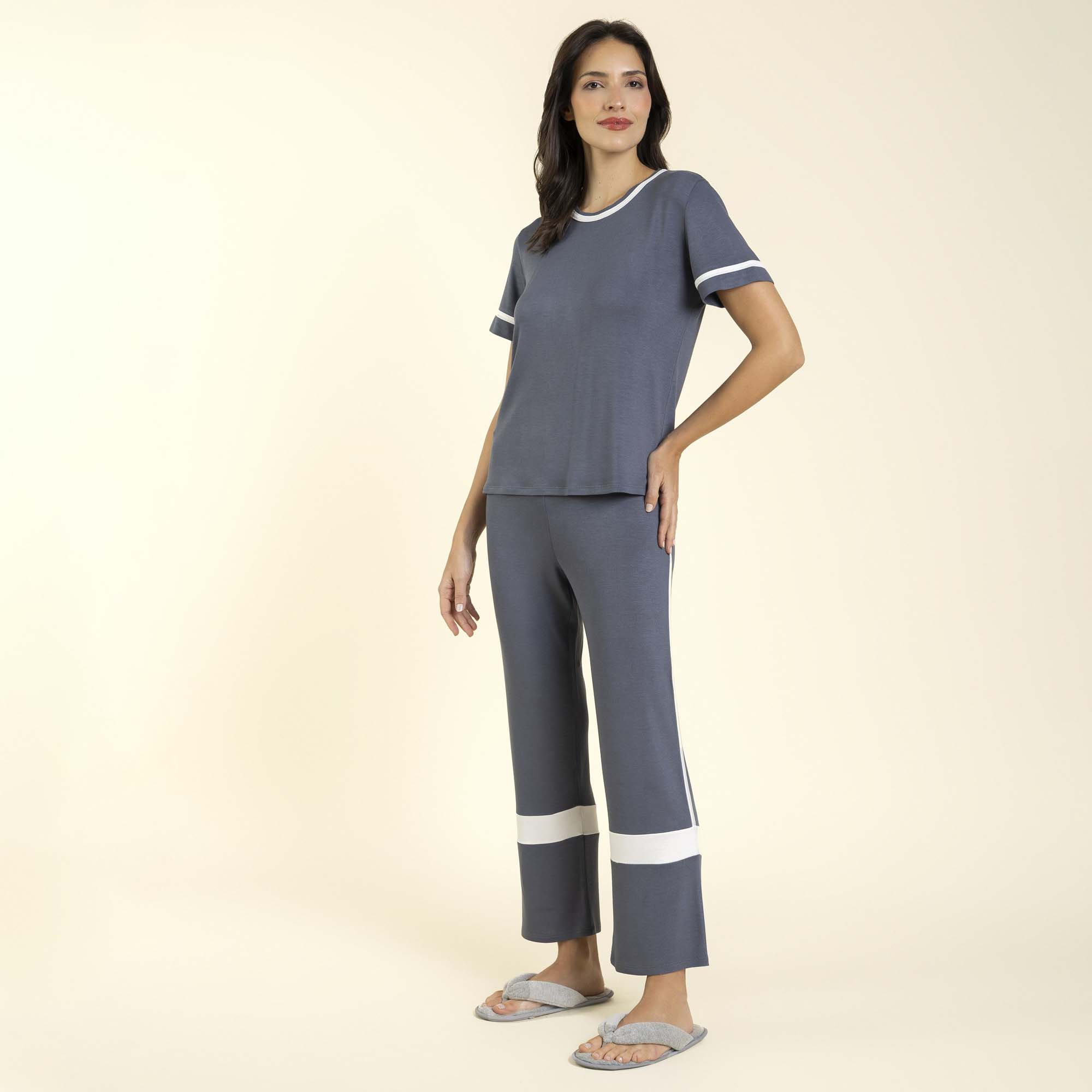 O conjunto em cinza azulado cromo, em visco tricot heavy, tem blusa de manga curta, decote arredondado e detalhes e viés branco. A calça é modelo capri, possui detalhes em branco na lateral e próximo a barra.