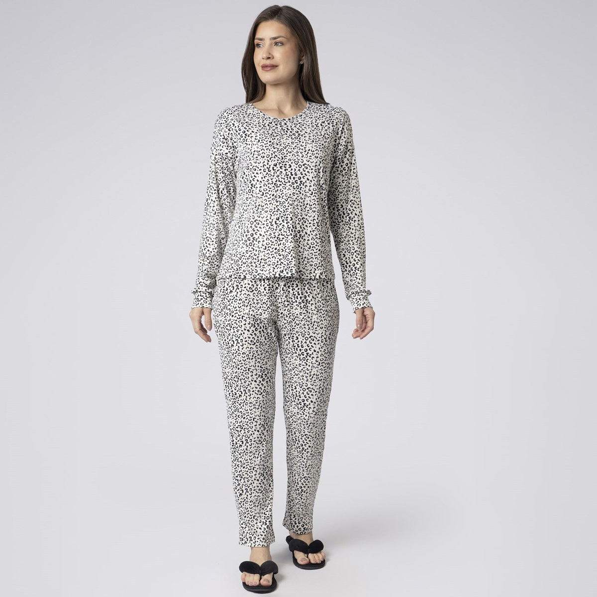 A blusa de manga longa, em malha canelada, possui decote arredondado e acabamento embutido nos punhos. A calça longa apresenta caimento leve e confortável. A estampa onça em preto e branco confere personalidade e elegância ao conjunto.
