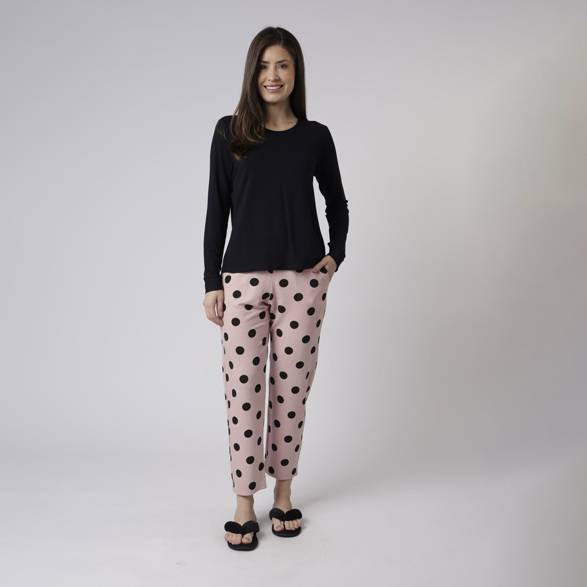 A blusa preta, em moletinho de viscose, possui manga longa, decote arredondado, toque macio e modelagem confortável. A calça levemente fusô e com bolso, na estampa poá rosa lingerie, completa o conjunto com charme e suavidade.