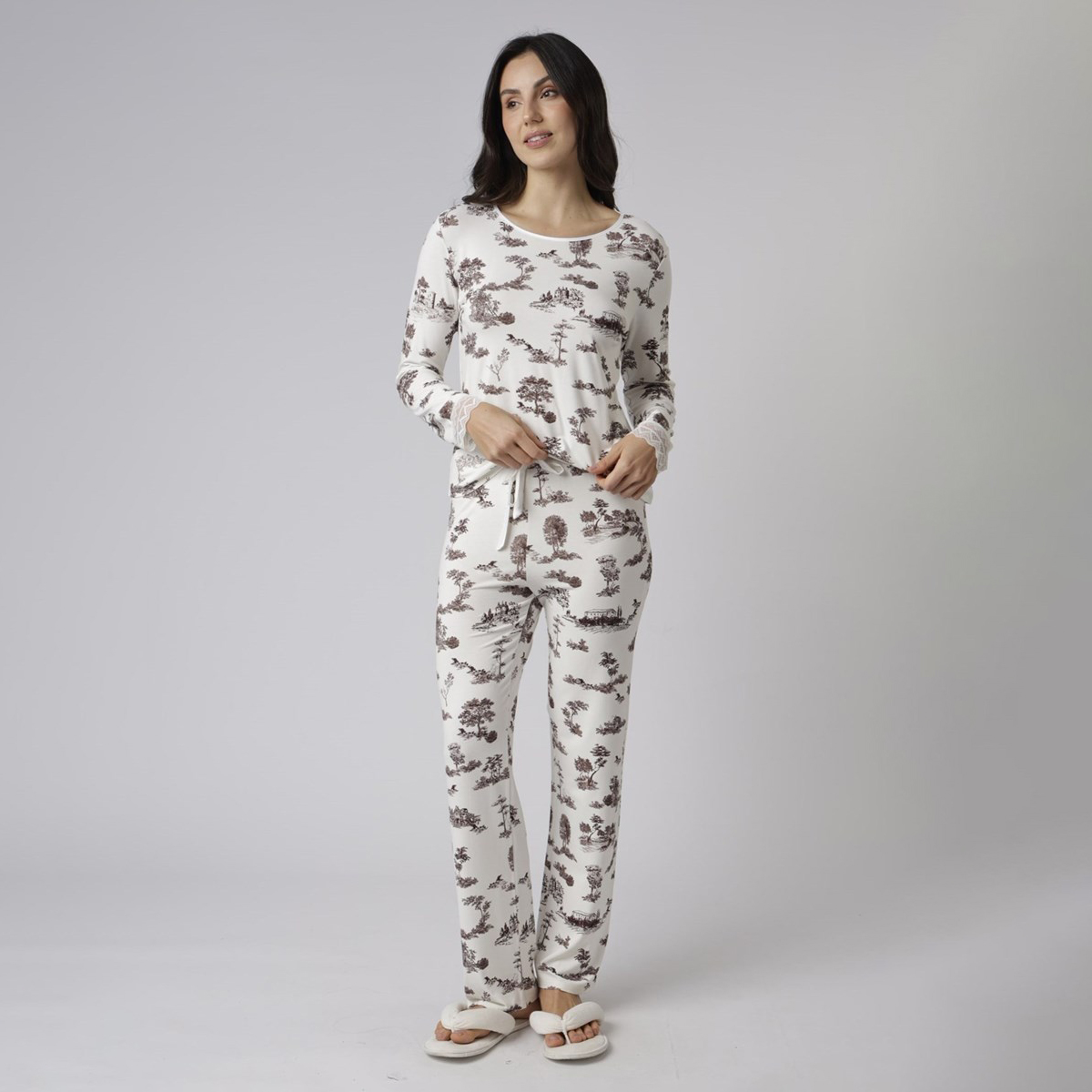 A blusa de manga longa, em visco comfort, apresenta modelagem confortável, decote arredondado e renda recortada, enquanto a calça longa, no mesmo tecido, possui caimento leve. A estampa toile completa o visual com elegância.