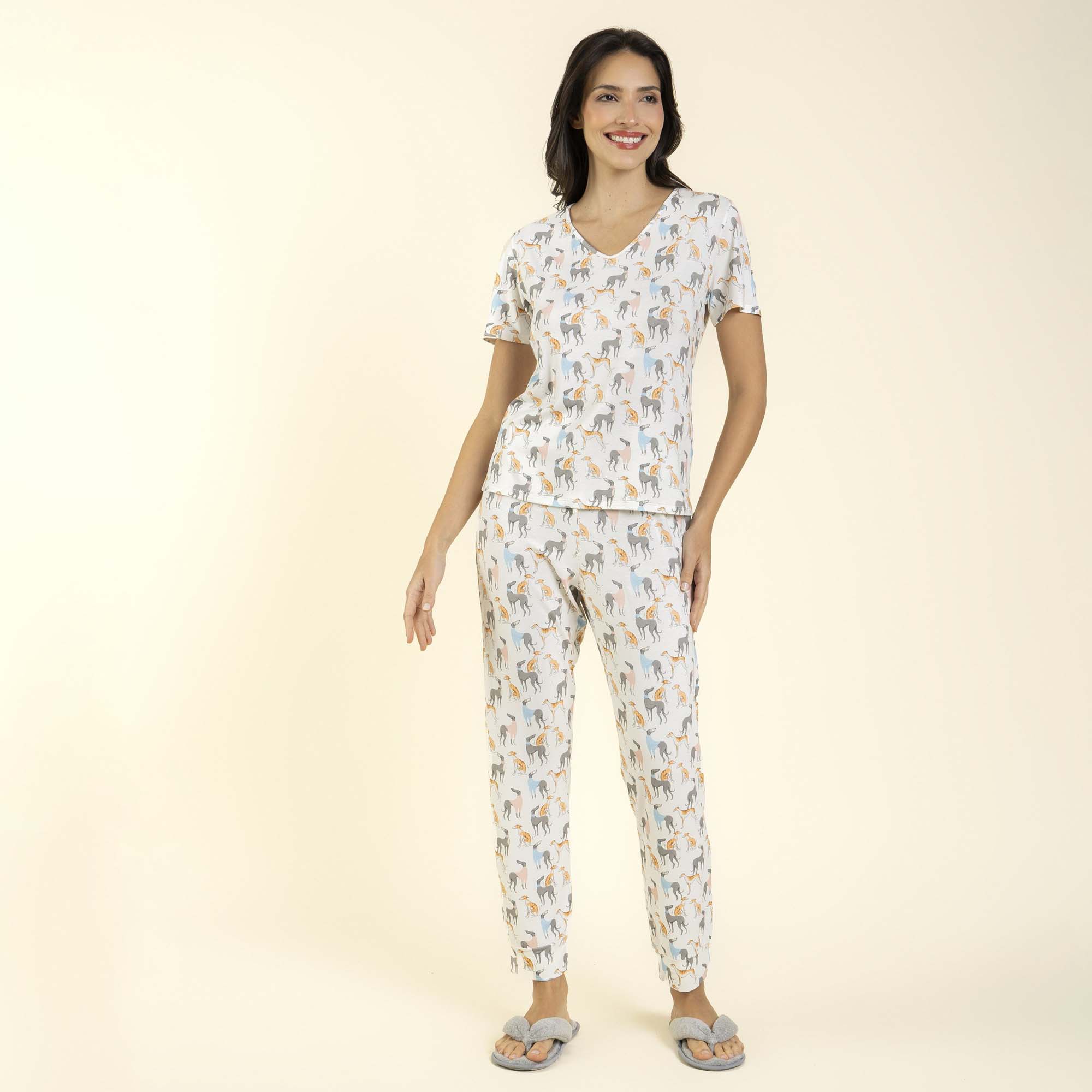 O modelo, em visco comfort, tem blusa de manga curta com decote arredondado e estampa greyhound no fundo branco. A calça tem modelo fusô, punhos e estampa greyhound no fundo branco.
