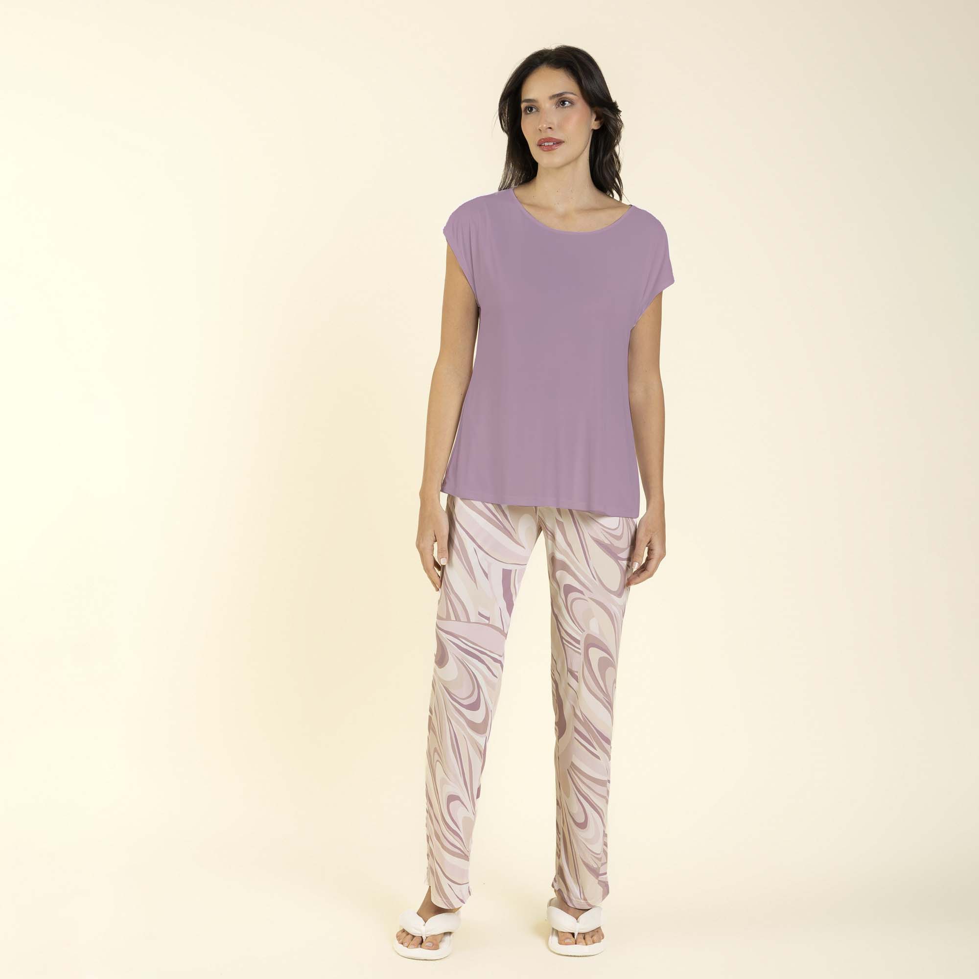 O modelo, em microfibra poliamida, tem blusa de manga curta, decote arredondado e cor lilás. A calça tem modelagem reta, leve e cor lilás com estampa embru art.