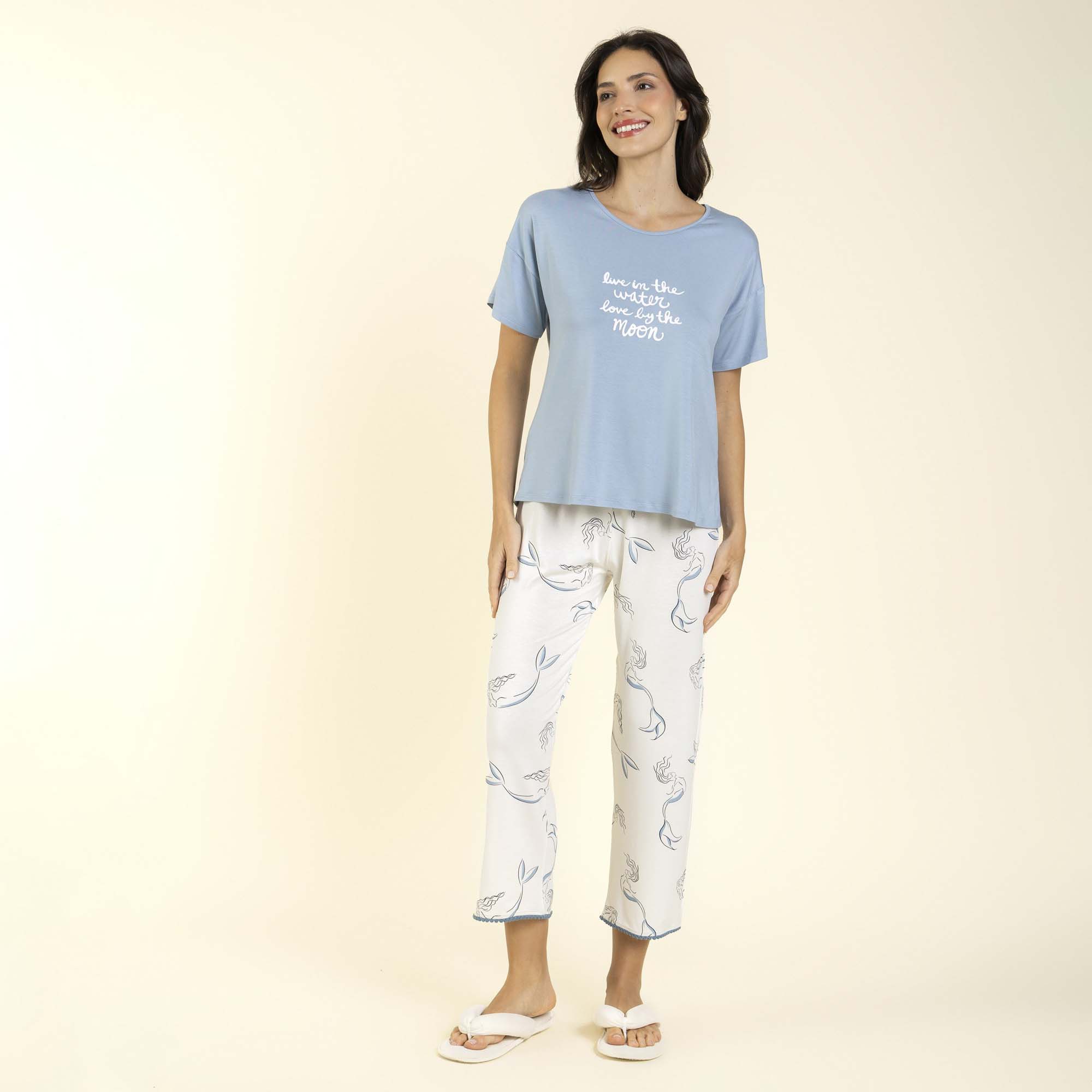 O modelo, em visco comfort, tem blusa de manga curta, decote arredondado, cor azul sereno e escrita: "Live in the water, love by the moon". A calça é modelo pantacourt na cor branca e estampa de sereia.