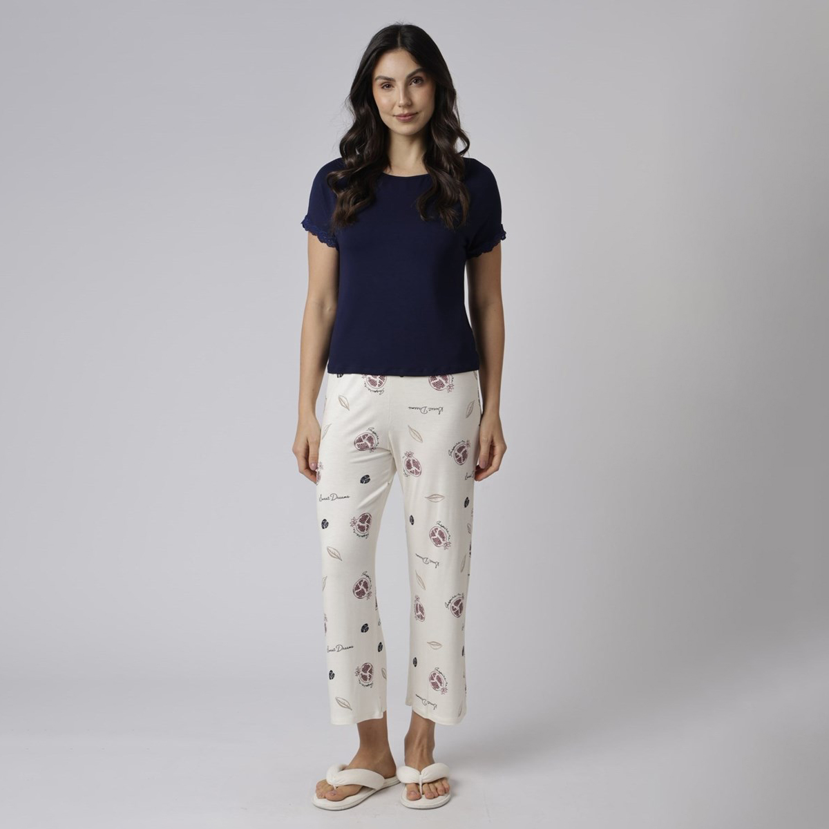 A blusa de manga curta, em visco comfort, tem decote arredondado e renda estreita nas mangas, além da linda cor marinho. A calça pantacourt, no mesmo tecido, apresenta estampa delicada de romãs, criando um contraste elegante com o tom da blusa.