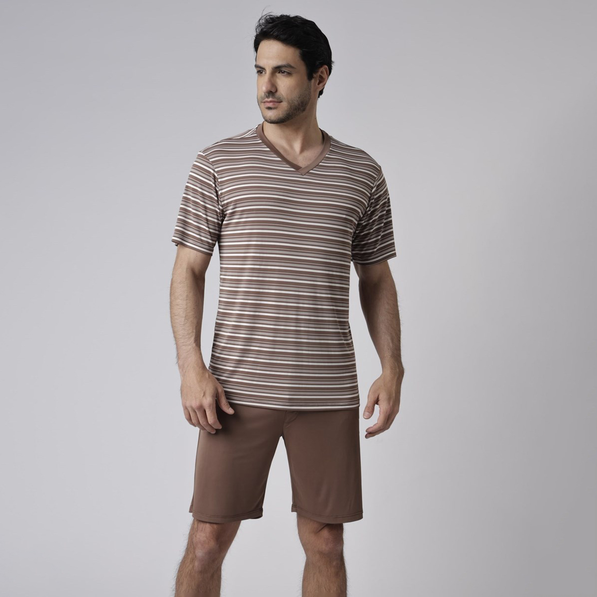 A blusa em estampa listrada choco possui gola ‘V’ em tecido liso, caimento leve e toque macio, enquanto a bermuda lisa em tom marrom completa o visual com equilíbrio e sofisticação. O tecido em micro poliamida garante frescor, elasticidade e suavidade na pele.