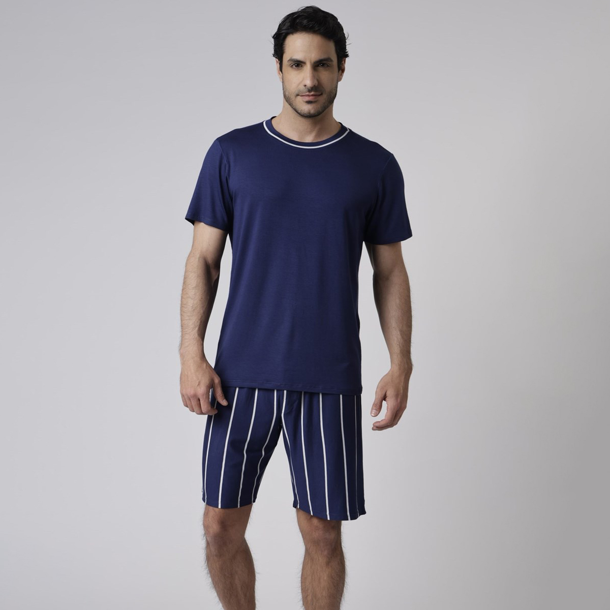 A blusa lisa em tom marinho tem blusa de manga curta e gola arredondada, enquanto a bermuda em estampa listrada complementa o visual com modernidade. O tecido malha visco é respirável e oferece bem-estar durante o uso.
