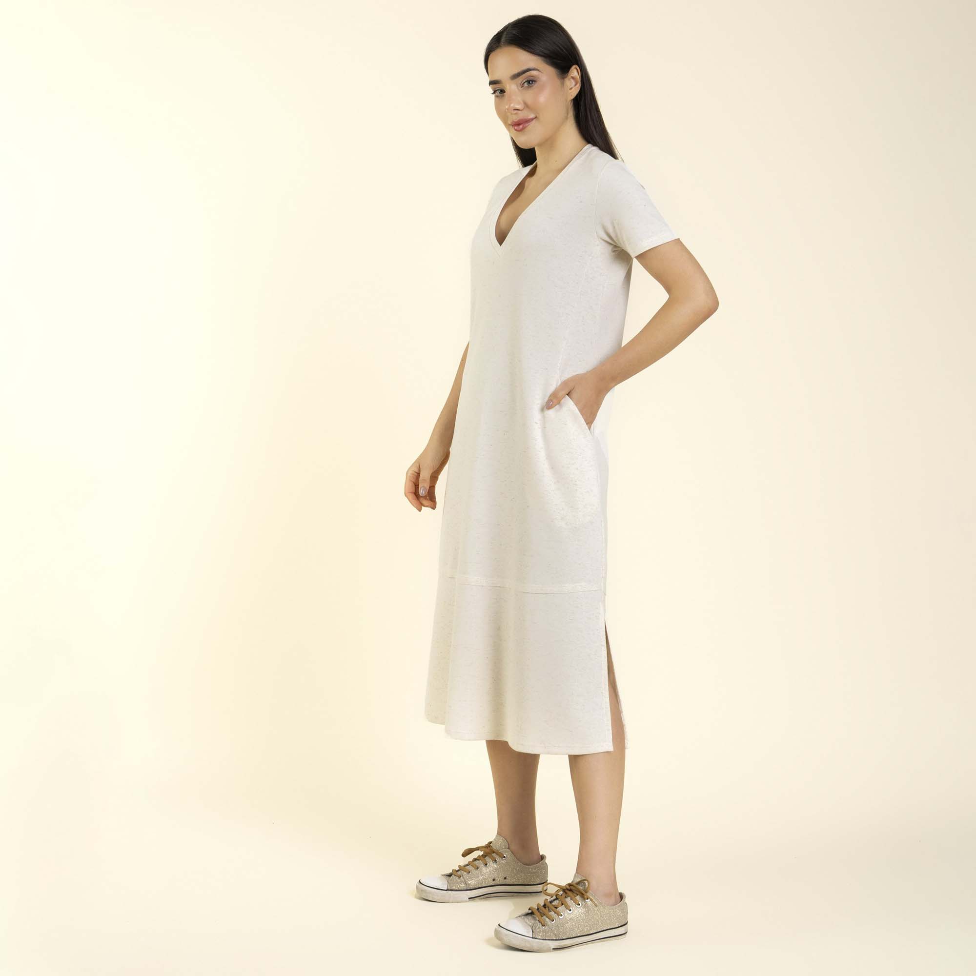Confeccionado em tecido naturale algodão, possui comprimento midi, mangas curtas, decote em “V”, bolsos e caimento reto com recorte na barra, garantindo frescor e sofisticação em qualquer ocasião.