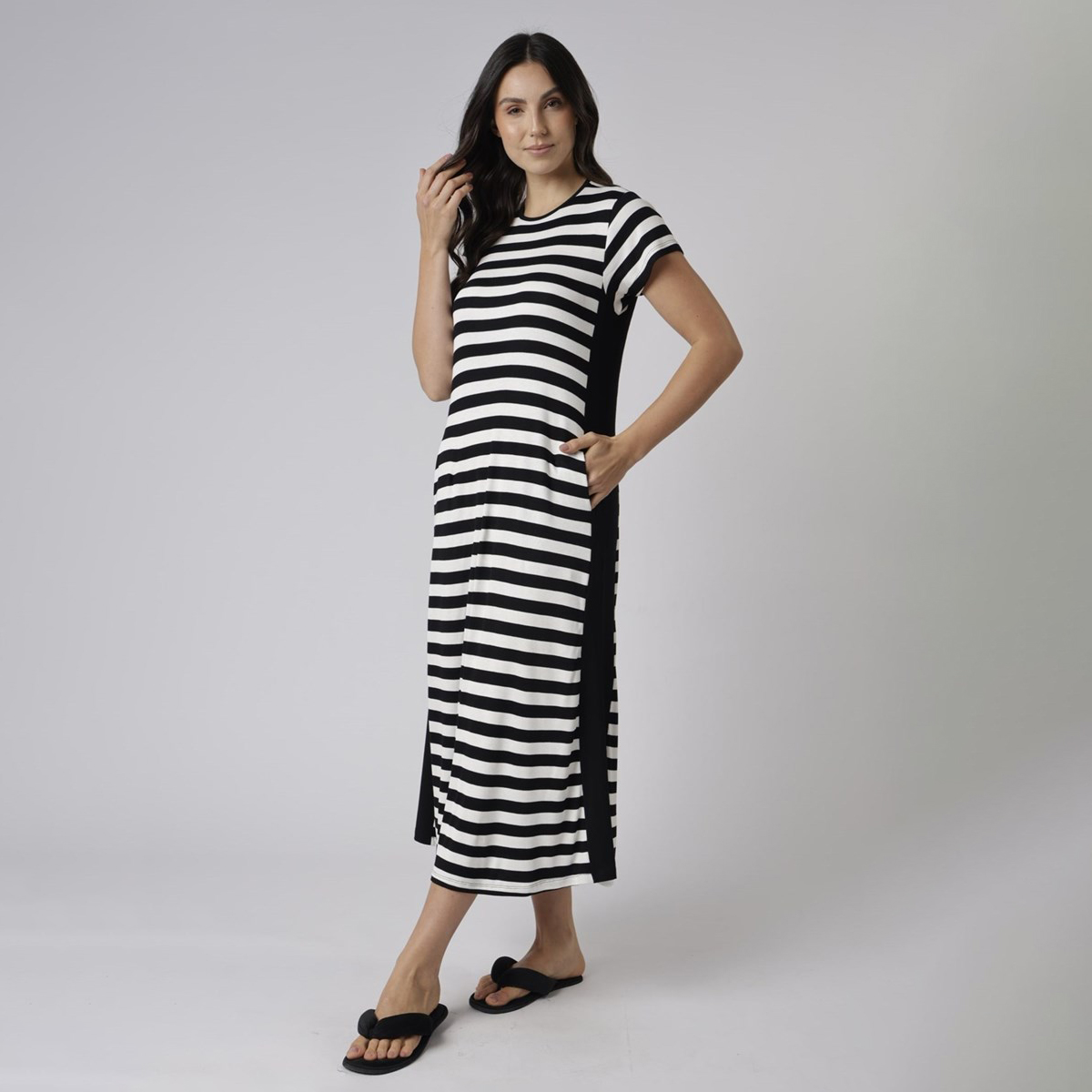 O Vestido Midi Listrado, da Linha Modern Homewear Inverno 2026, oferece conforto e estilo em uma peça versátil, ideal para momentos de descanso ou uso casual.